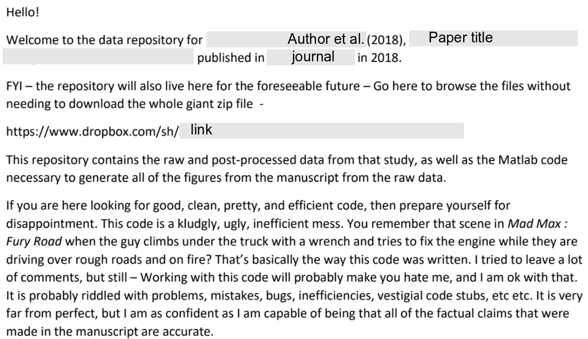 This code is a kludgly, ugly, inefficient mess. (…) It is probably riddled with problems, mistakes, bugs, inefficiencies, vestigial code stubs, etc etc. (…) I am as confident as I am capable of being that all of the factual claims that were made in the manuscript are accurate.